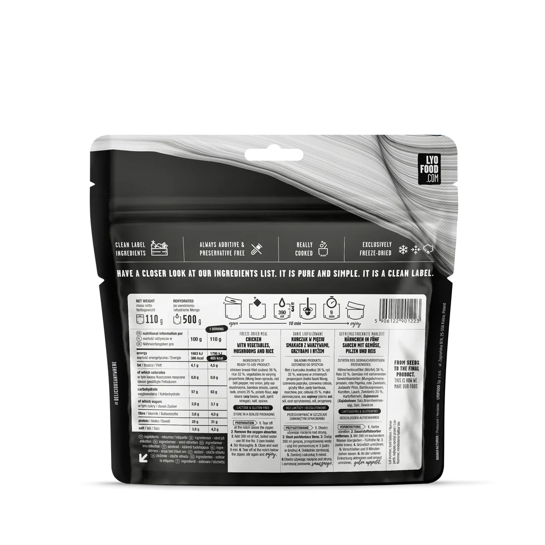 Why is LYO Five-Spice Chicken so worth trying out? First, what a mix this is! Bamboo shoots, mung bean sprouts, jelly ear mushrooms and soy sauce are combined with rice, succulent chicken breast pieces and veggies to bring back memories of your favorite Chinese restaurant. Secondly, it wouldn’t be as good if it wasn’t prepared in a genuine way! Prior to freeze-drying we cook our meals in small batches, so they maintain their delicious and authentic taste. For those long and grueling days spent outdoors, LYO Five-Spice Chicken is the perfect fuel to keep you going.
