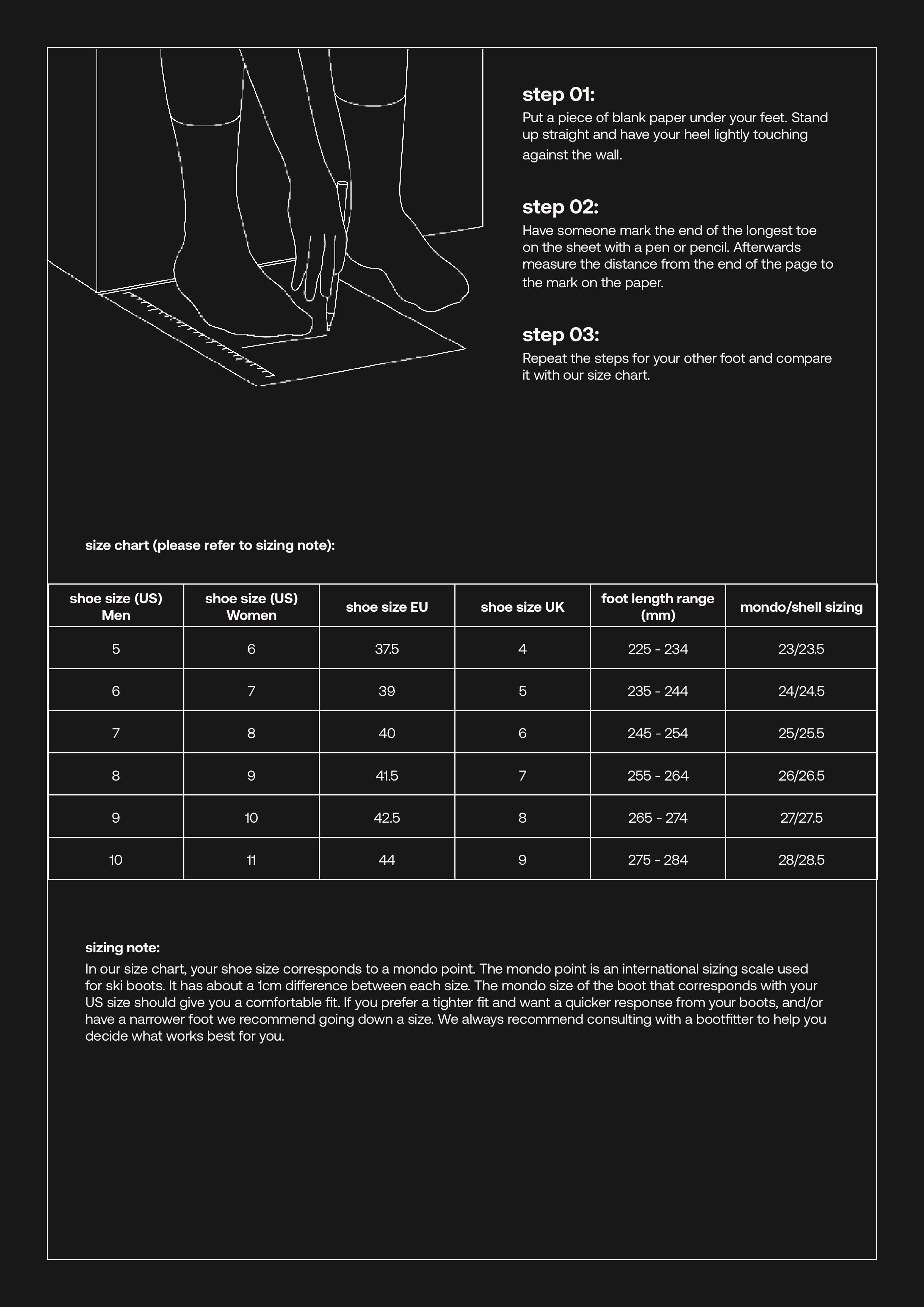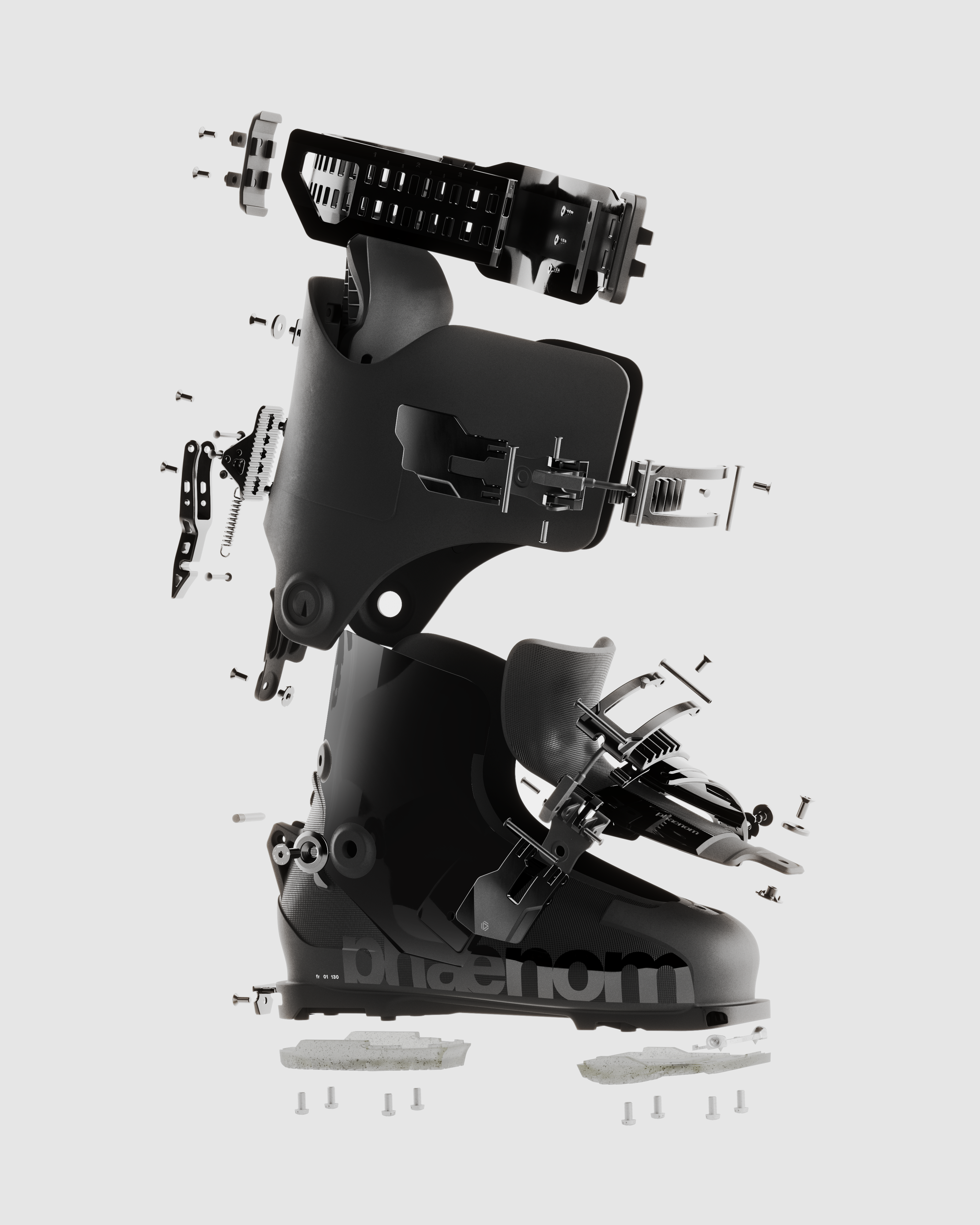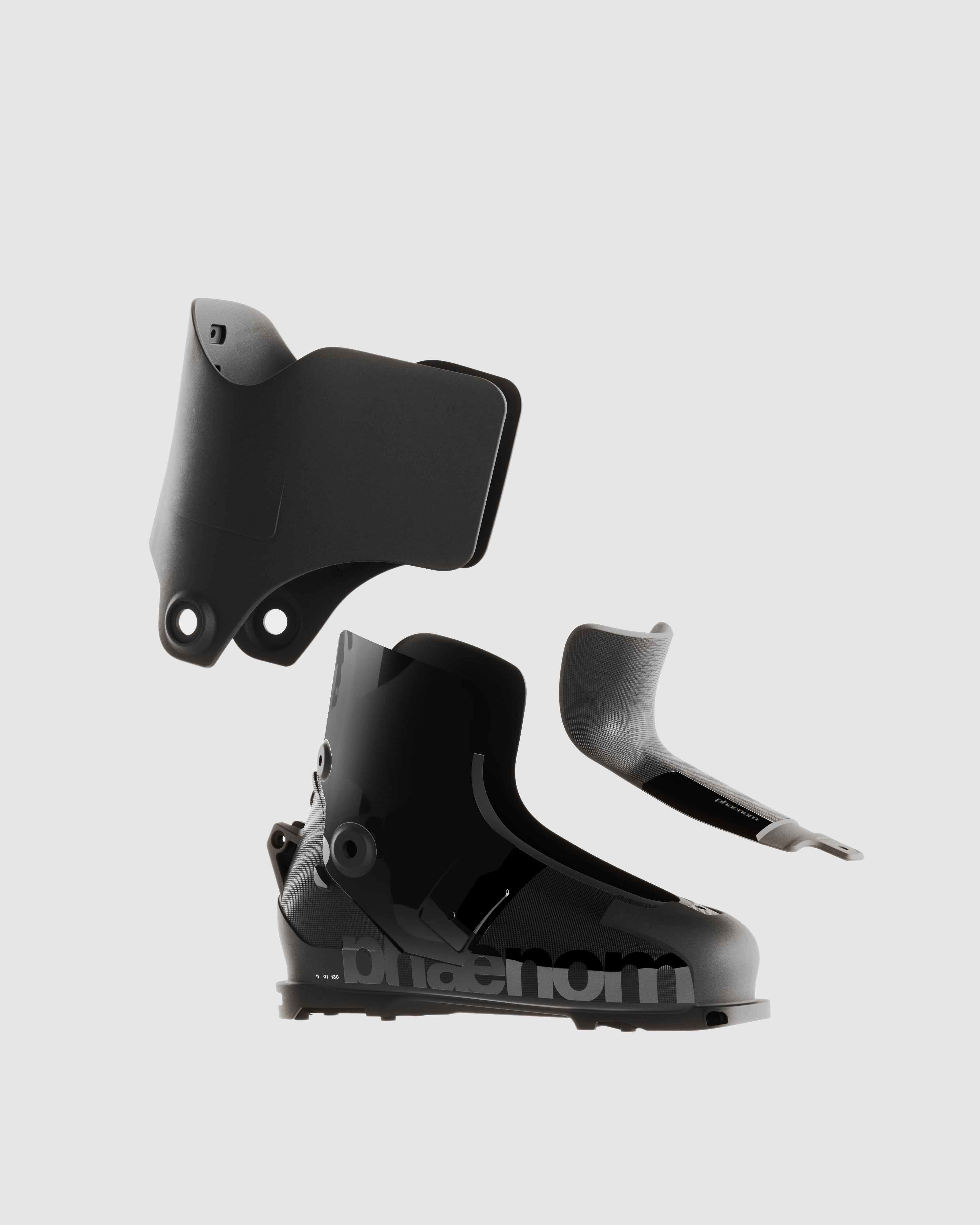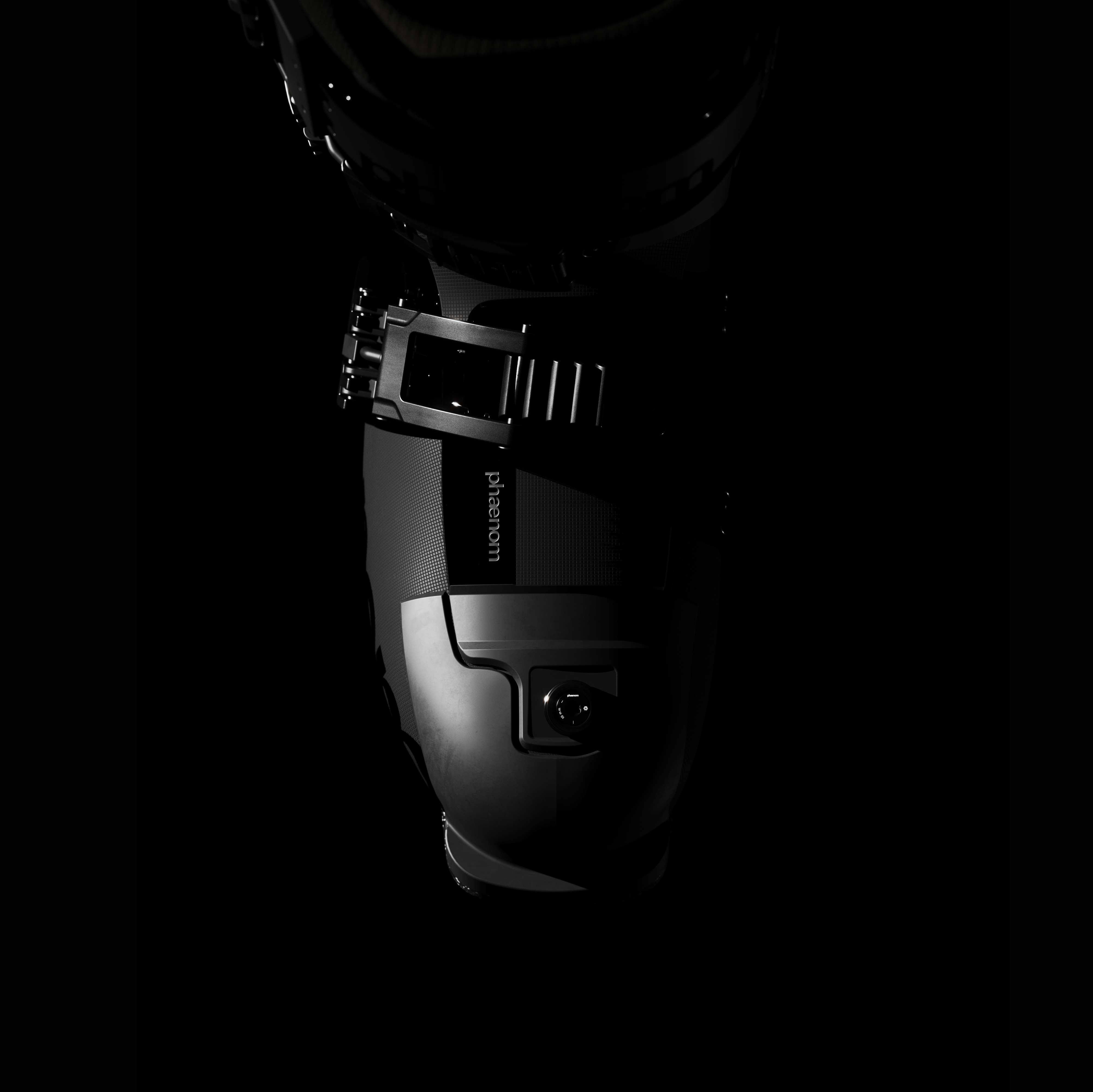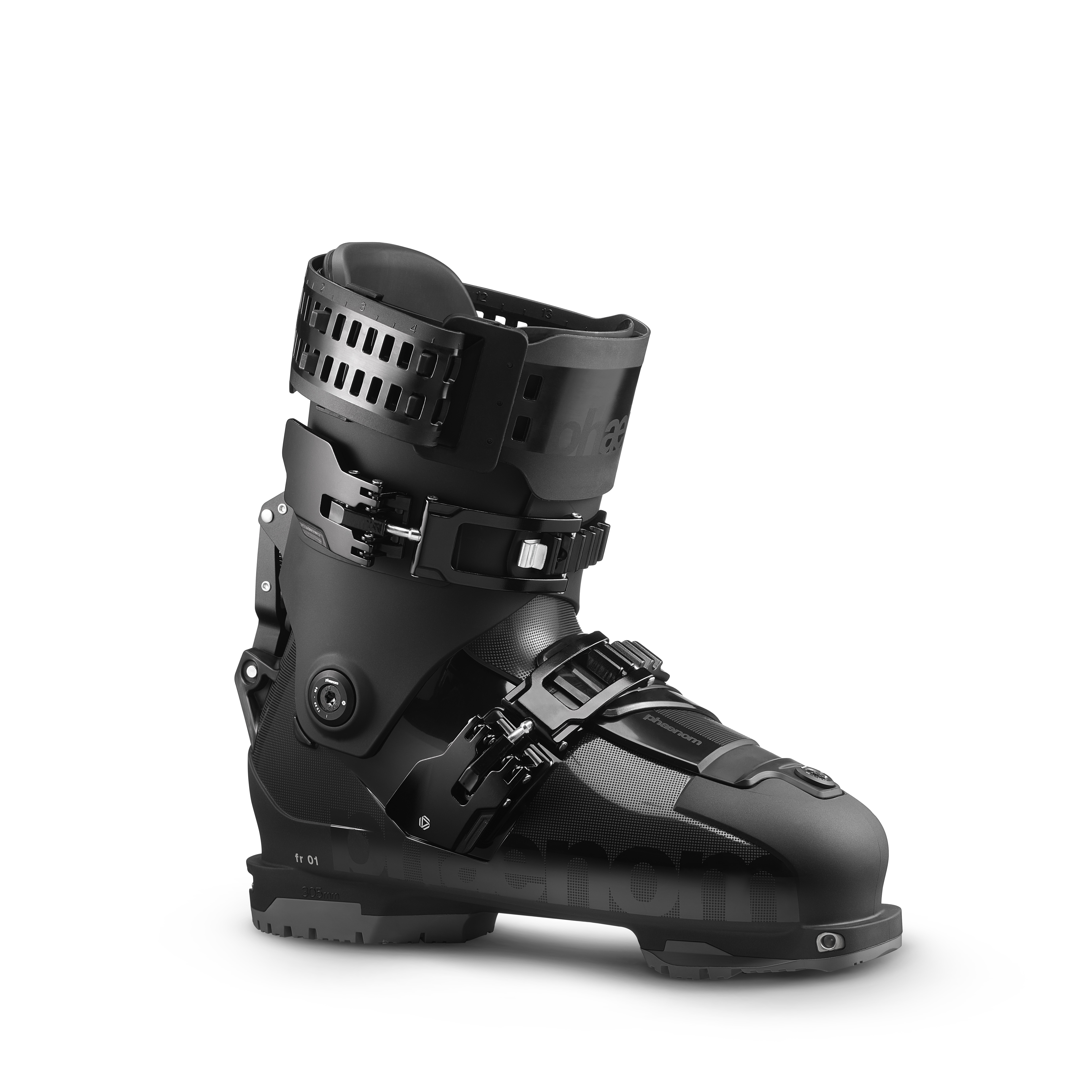 The fr 01 110 freeride boot is designed for those seeking both comfort and performance. This all-new ski boot offers a more forgiving yet responsive feel. The innovative hybrid cabrio / overlap construction combines the best of both worlds: the close fit and edge control of the overlap, and the progressive flex of the 3-piece. Paired with the patent-pending phaenom strap, the fr 01 110 provides rebound, shock absorption and exceptional flex control. The elasticity of the strap generates tangible rebound through your turns, for increased power transmission, turn initiation precision, comfort and predictability. The sleek all-black design supports restoration and reuse of the boot and its parts. Each element of this product — from panels to buckles to straps and screws — is designed to be repairable and recyclable.